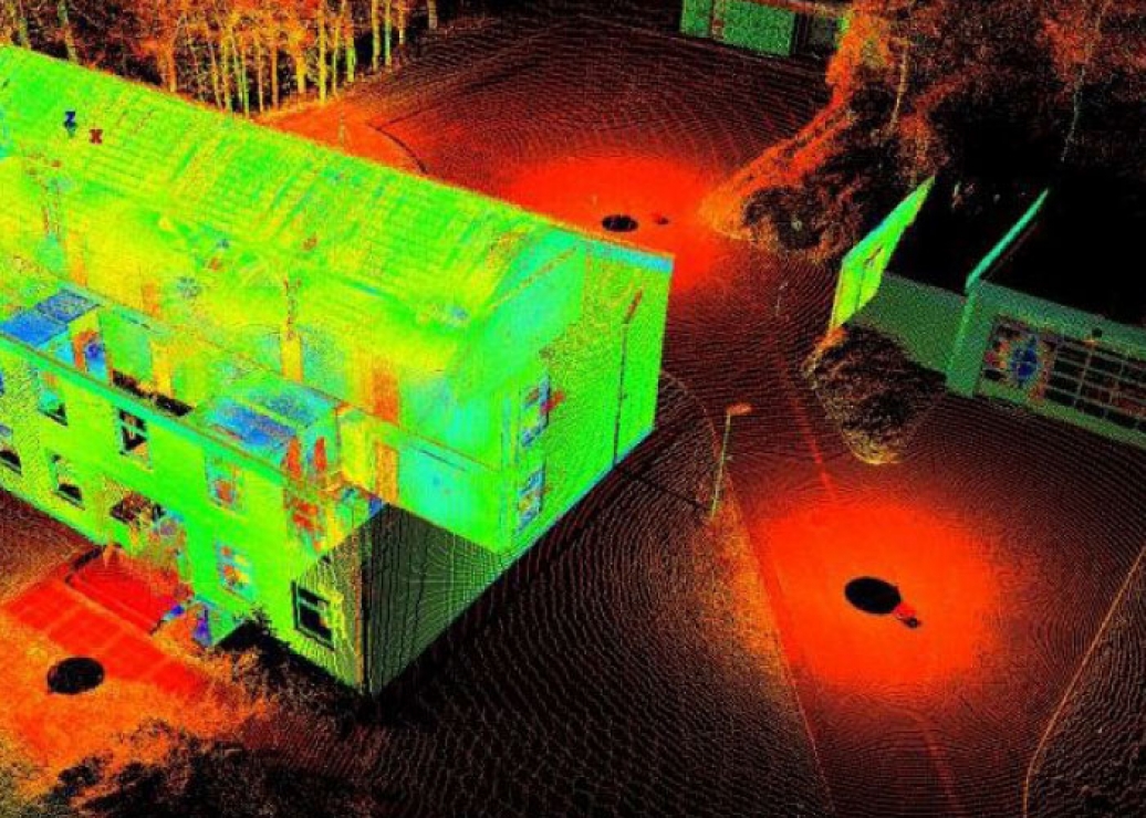 Über die entstandenen Punktwolken wurden im Nachgang Panoramafotos gelegt und somit die Gesamtpunktwolke eingefärbt. Für jedes Gebäude wurde ein dynamic Scanview (dSV) erzeugt und dem Kunden für Präsentationszwecke als Videobegehung zur Verfügung gestellt.