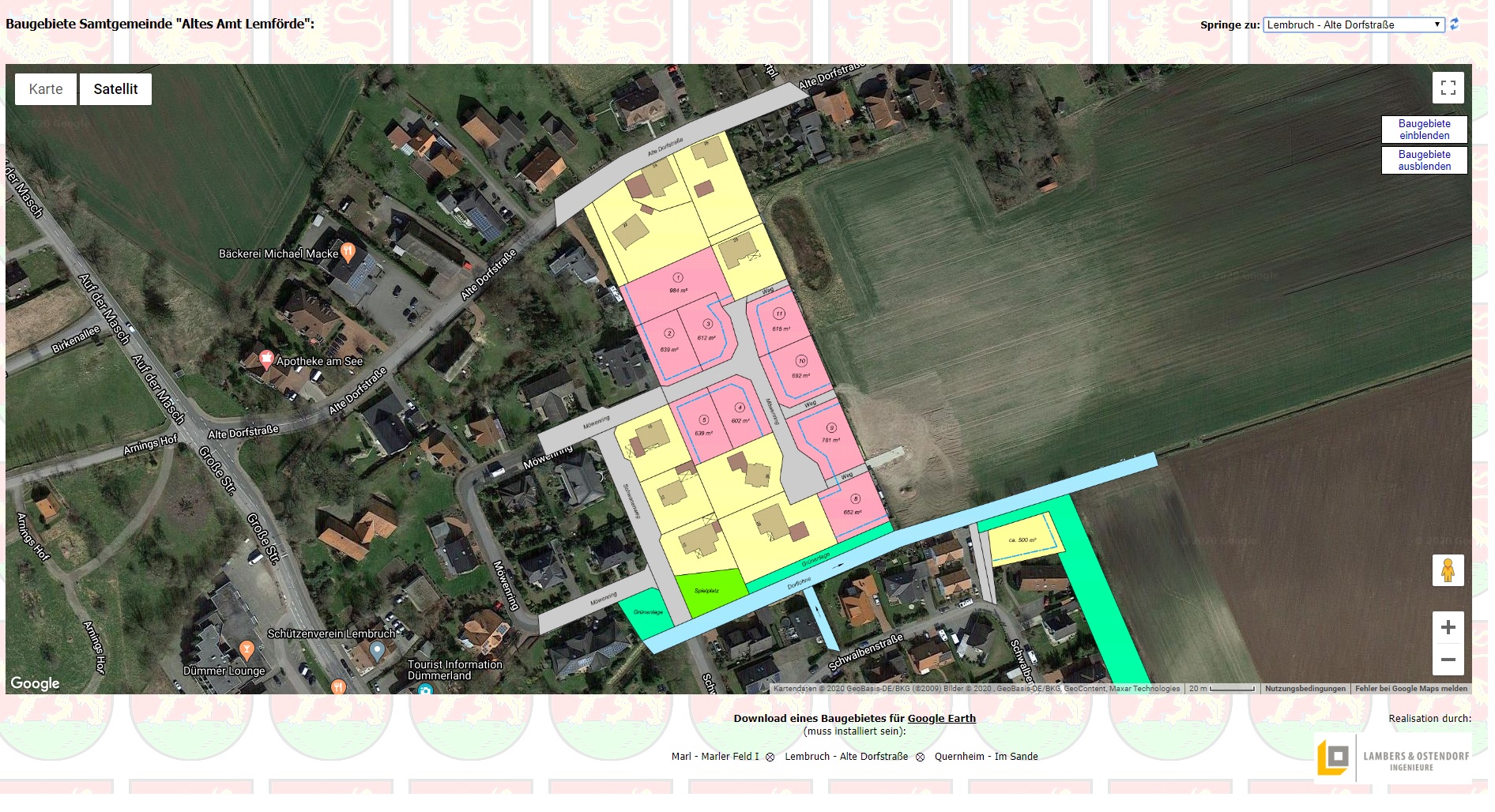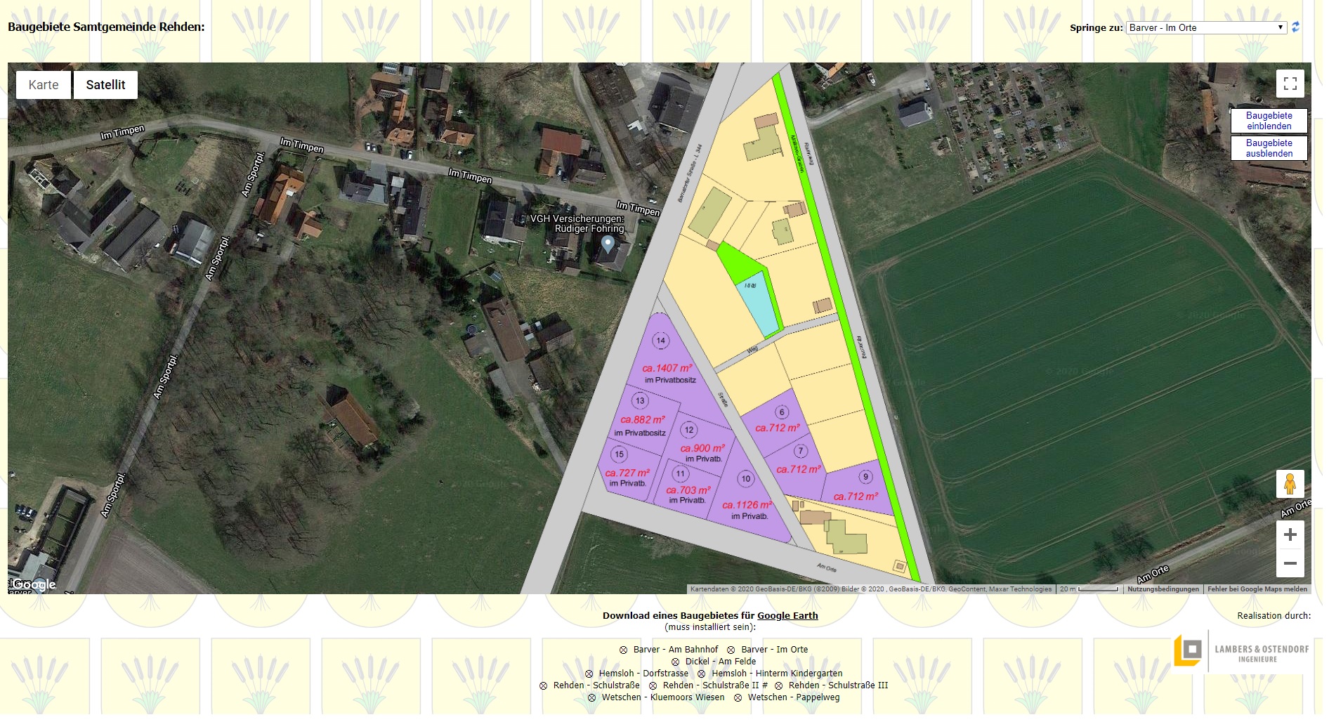 Auf Basis von Google Maps wurden für diverse Kommunen deren Baugebiete aufbereitet und im Internet veröffentlicht. Diese Form der Darstellung hat viele Vorteile. So kann sich ein Bauwilliger anhand der Luftbilder von Google Maps gleich einen Überblick über die Umgebung rund um sein potenzielles Baugrundstück sowie die umliegende Infrastruktur machen. Selbstverständlich ist der genaue Schnitt der Baugrundstücke mitsamt Ausrichtung, Größe und häufig sogar den einzuhaltenden Baugrenzen zu erkennen.