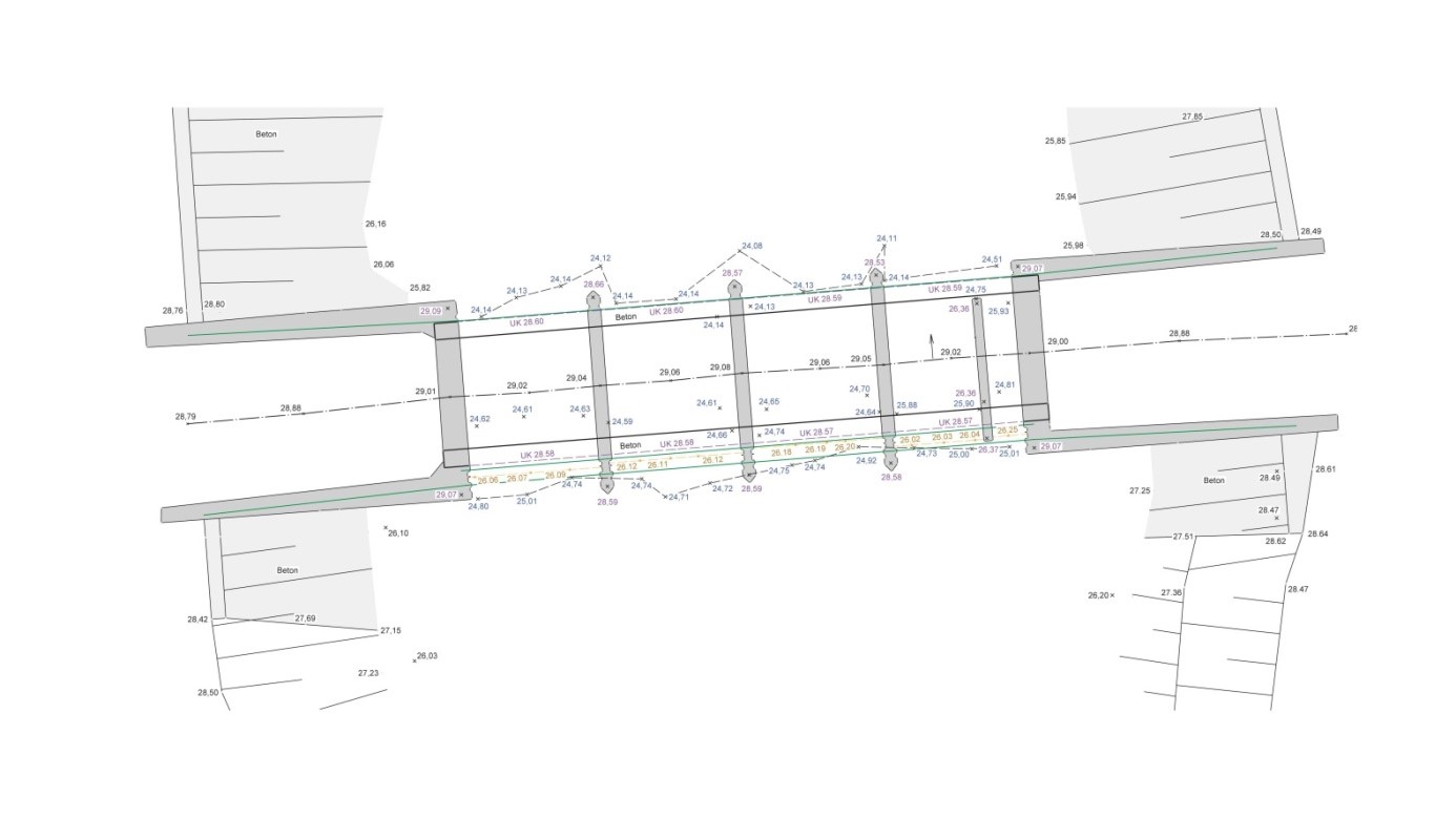 Für die Umgestaltung einer Wehranlage sollte diese aufgemessen werden, um aus unseren Daten neue Bestandspläne zu erstellen. Da wir für die Bestandspläne auch Daten von den unzugänglichen Stellen der Wehranlage benötigten, haben wir uns dazu entschlossen, das Bauwerk mit unserem Laserscanner zu erfassen. Als Ergebnis wurde eine referenzierte Punktwolke ausgegeben, aus der dann die erforderlichen Daten abgeleitet werden konnten.
