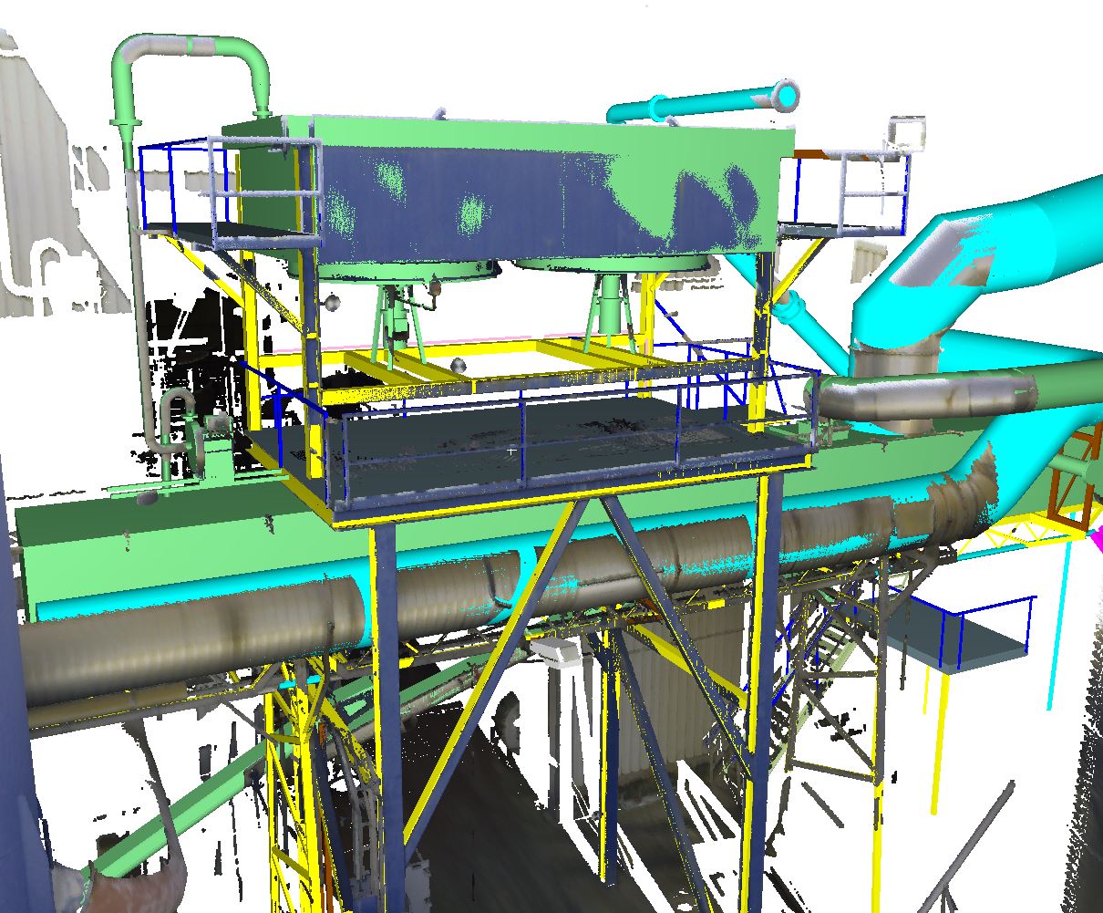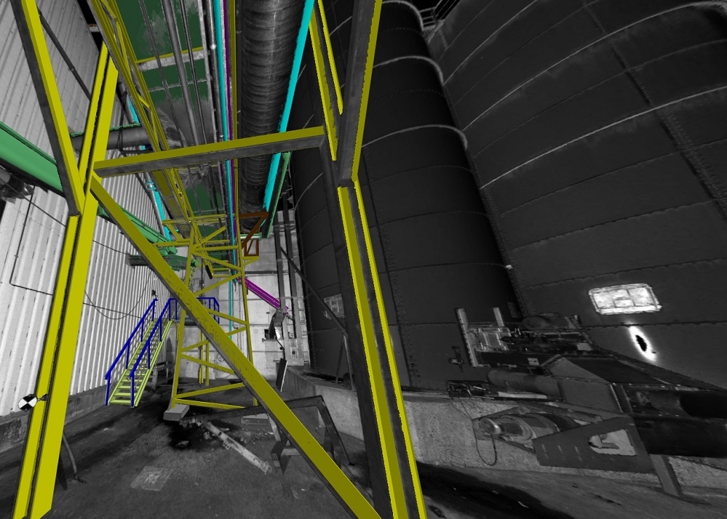 Zur Trassenfindung für eine neu zu errichtende Rohrleitung wurde der Bestand vor Ort per Laserscanner erfasst und aus den Daten ein 2D-Plan und ein 3D-Modell abgeleitet. So konnte die neue Leitung virtuell durch vorgegeben Zwangspunkte verlegt und mittels Kollisionsprüfung die Abstände zu bereits vorhandenen Objekten kontrolliert werden. Trotz der Vielzahl an bereits bestehenden Rohrleitungen konnte dadurch sichergestellt werden, dass einer reibungslosen Ausführung der Leitungsverlegung keine Objekte im Wege stehen.