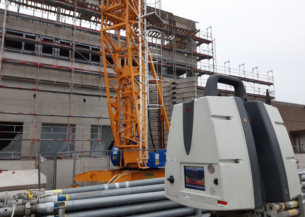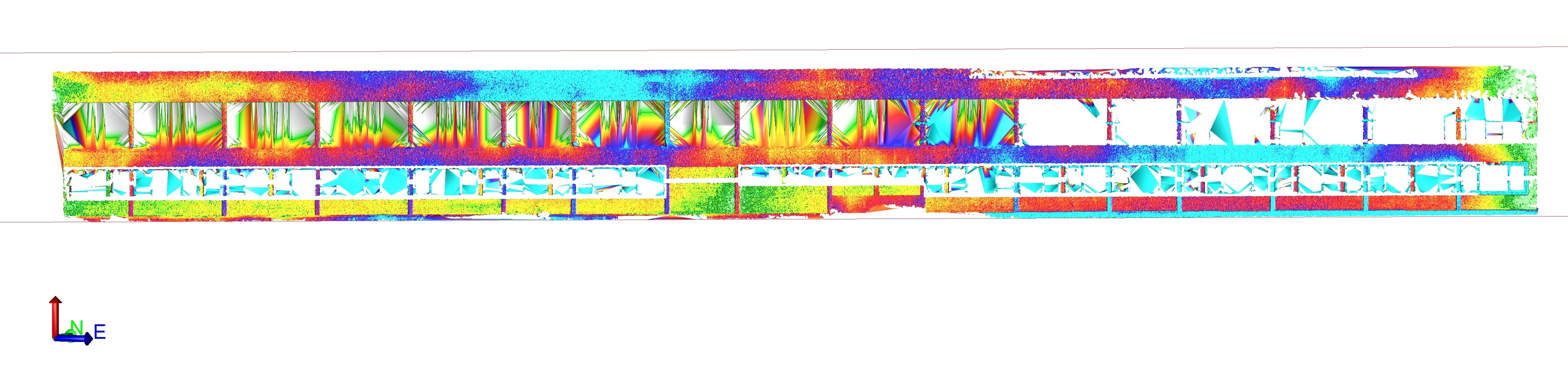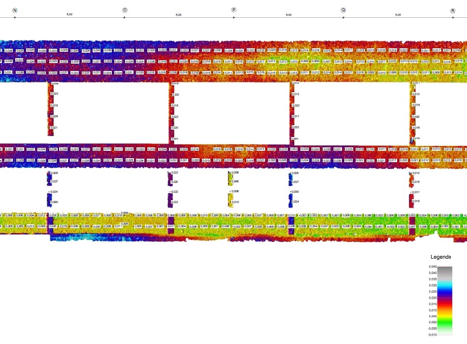 Während der Erweiterung eines Zentrallagers wurden die ca. 90 m langen Fassaden mittels 3D-Laserscanning auf Unebenheiten überprüft. Trotz Bautätigkeit und vorhandenem Gerüst war eine Erfassung möglich. Aus der erzeugten Punktwolke wurden 2D-Fassadenpläne abgeleitet. In einem vorgegebenen Raster wurden hier die Abweichungen zum Soll dokumentiert und mit einem Farbverlauf visualisiert.