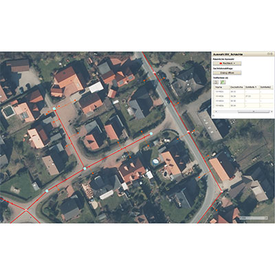 ![]() In einem Kanalkataster werden Kanaldaten wie beispielsweise Gefälle, Rohrdurchmesser, Daten zu Schächten wie Anzahl und Durchmesser der Ein- und Ausläufe dargestellt. |