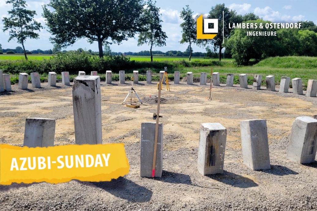 In Wirklichkeit soll hier ein Windrad entstehen und die Betonpfähle, die ihr auf dem Bild seht, ragen später in das Fundament hinein, um mehr Stabilität zu gewährleisten. Bevor das Fundament gegossen wird, müssen die Pfähle allerdings noch auf die richtige Höhe heruntergeschnitten werden.